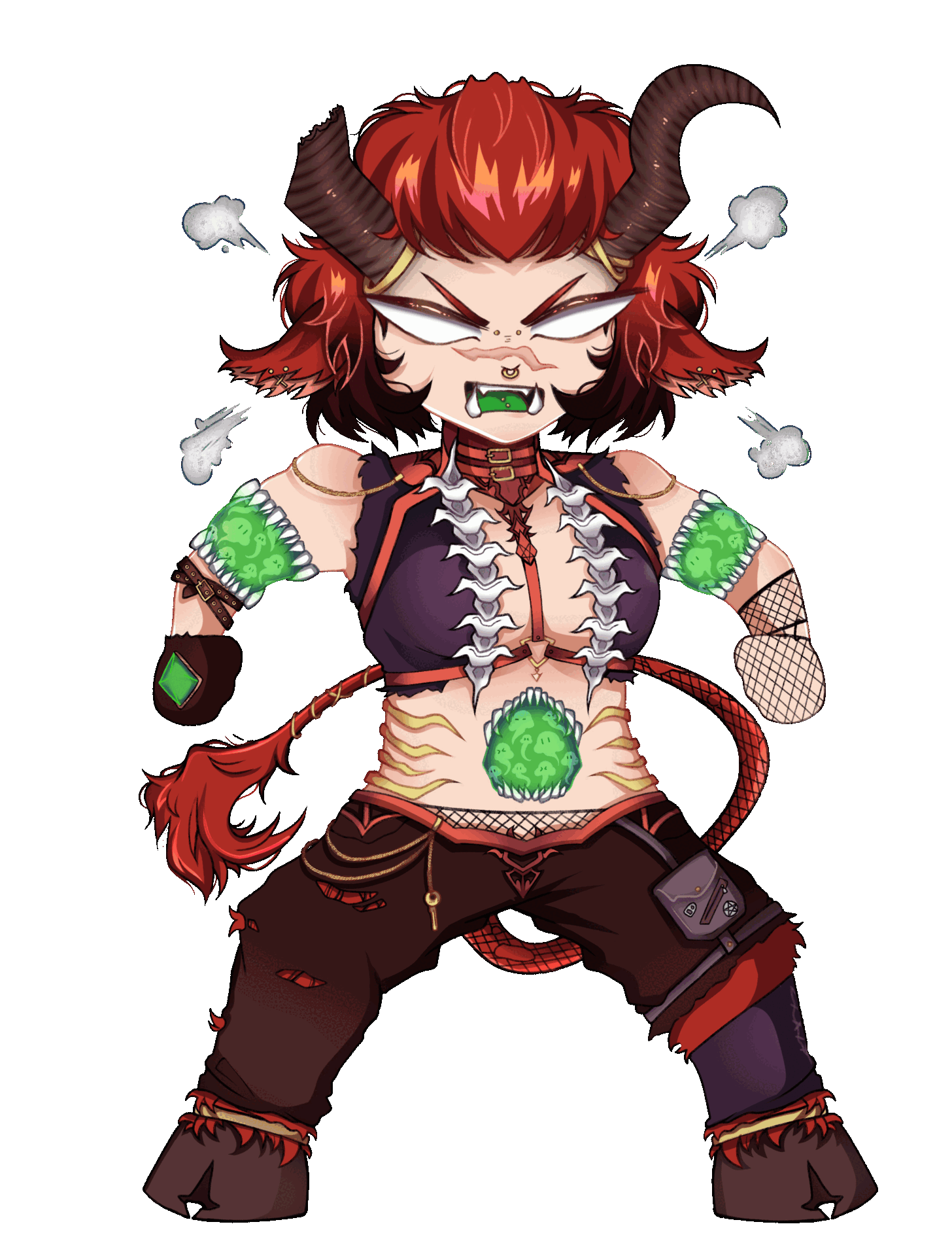 | Dark brown-reddish hooves | Two golden rings around the left horns And one on the right | Brown gradient pants that are ripped and missing a left pant leg |