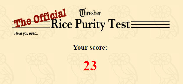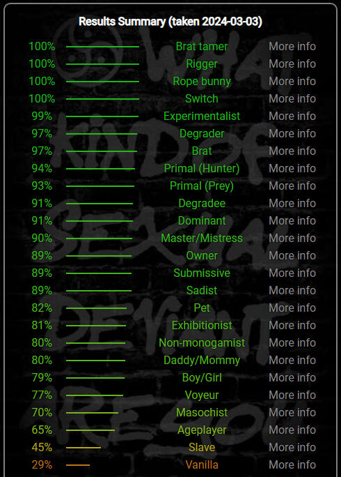 Well,Here ya go-Because of the requests- here is my kink list, rice purity test and BDSM Test results. (last taken March 2024)
