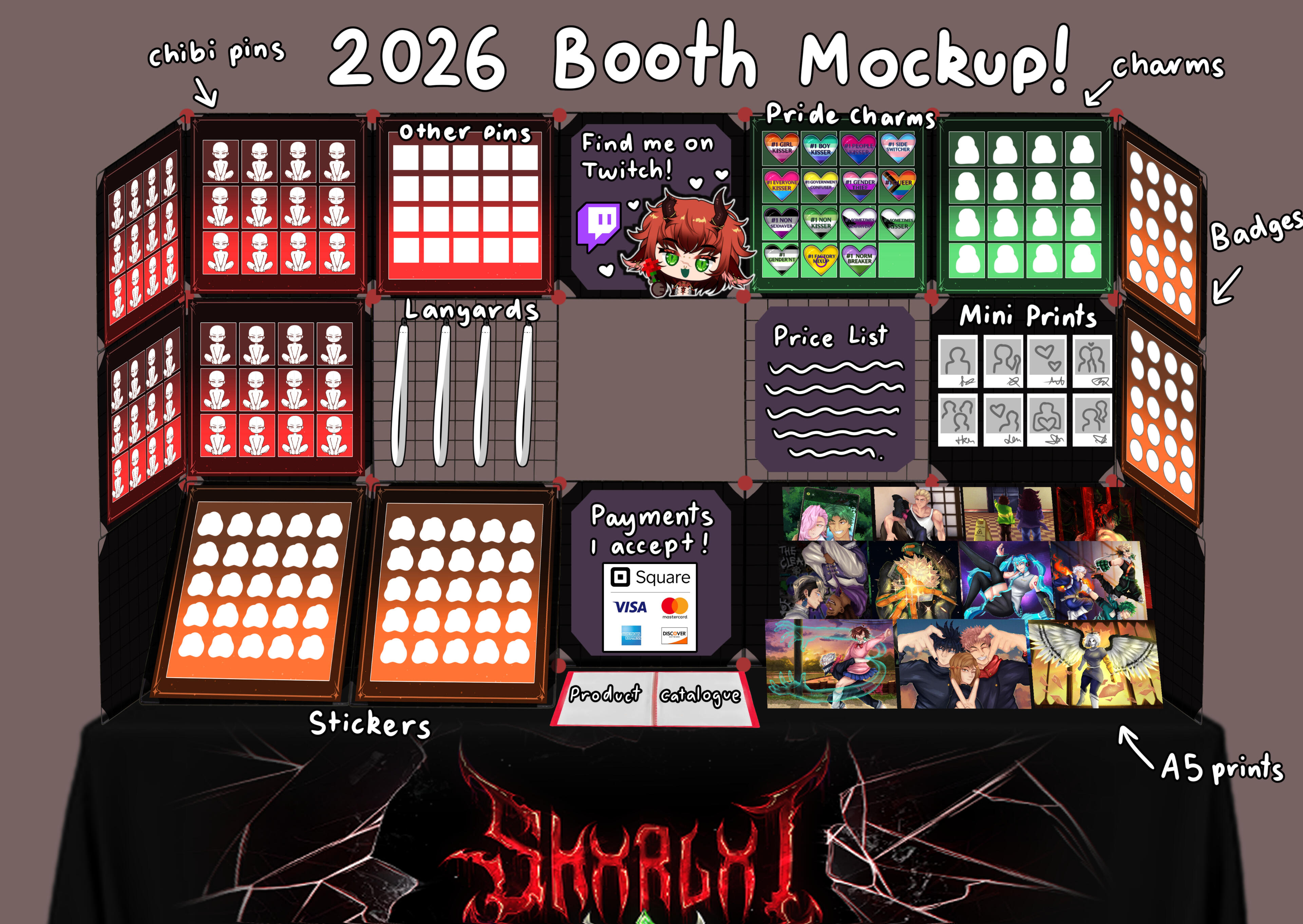 Yo! I'm Skarlet! A VTuber + Artist based in Sydney, Australia.I started my online art store in 2018 and have been vending at conventions and exhibitions since 2020. I specialize in both fan art and original art and produce a wide variety of products that get more expansive every year. Below are some of my reoccurring products!