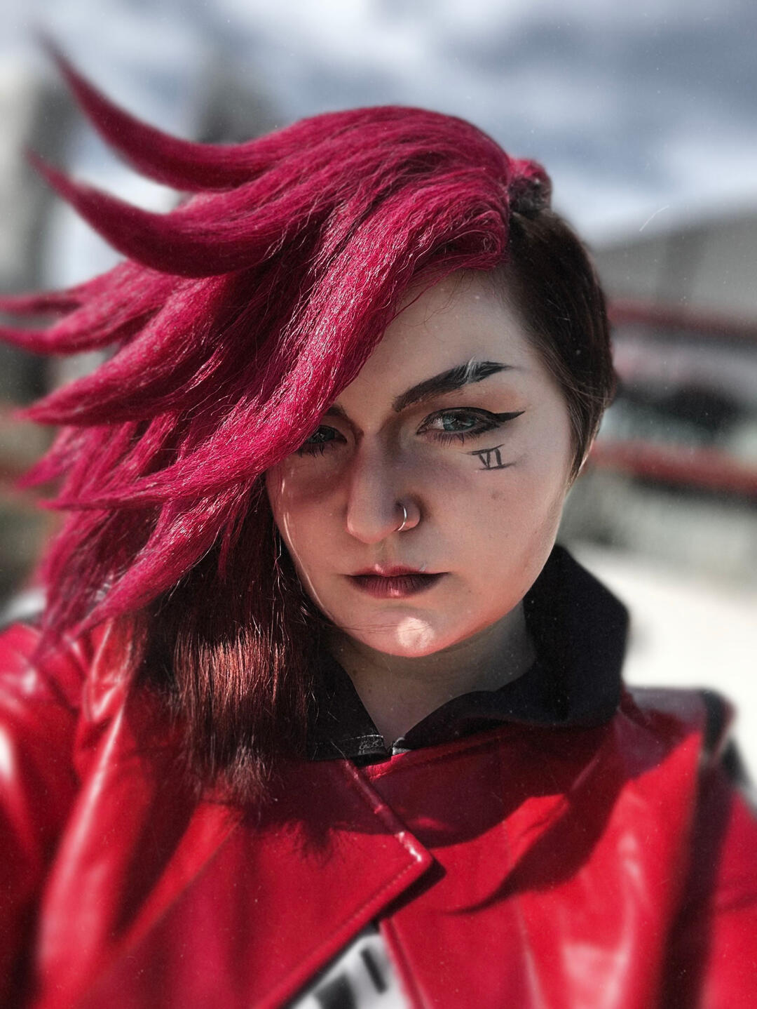 | Pale skin with a warm undertone | Piercings: Septum, Bridge, Double Industrial, Labret ring, Jacobs Ladder, double nipple piercings (diagonal) | Short, roughly cut dark coloured jacket |